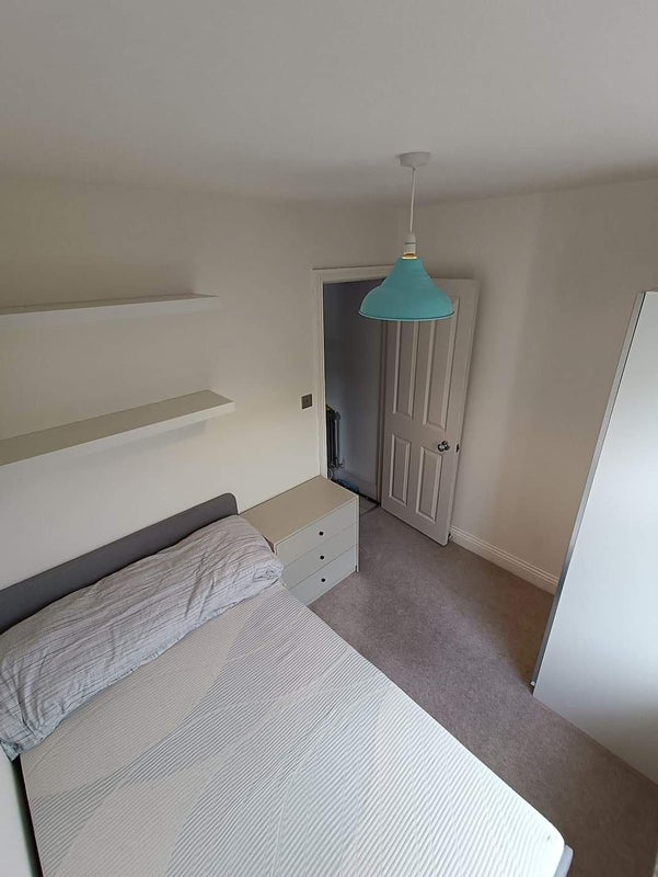 The room is at the back of the flat and it includes a small double bed, wardrobe and chest of drawers, under-bed and shelf storage. There’s no storage available outside of the room, so it’s best suited for someone who doesn’t have a lot of stuff.