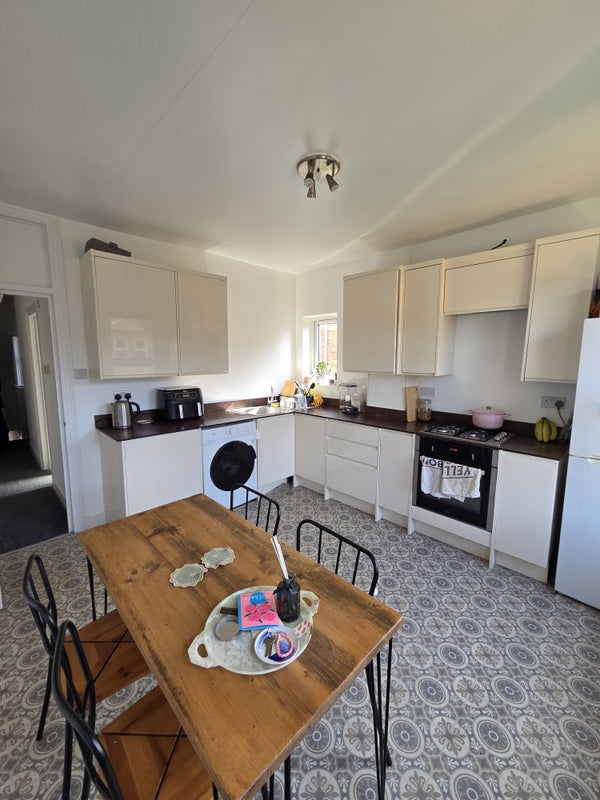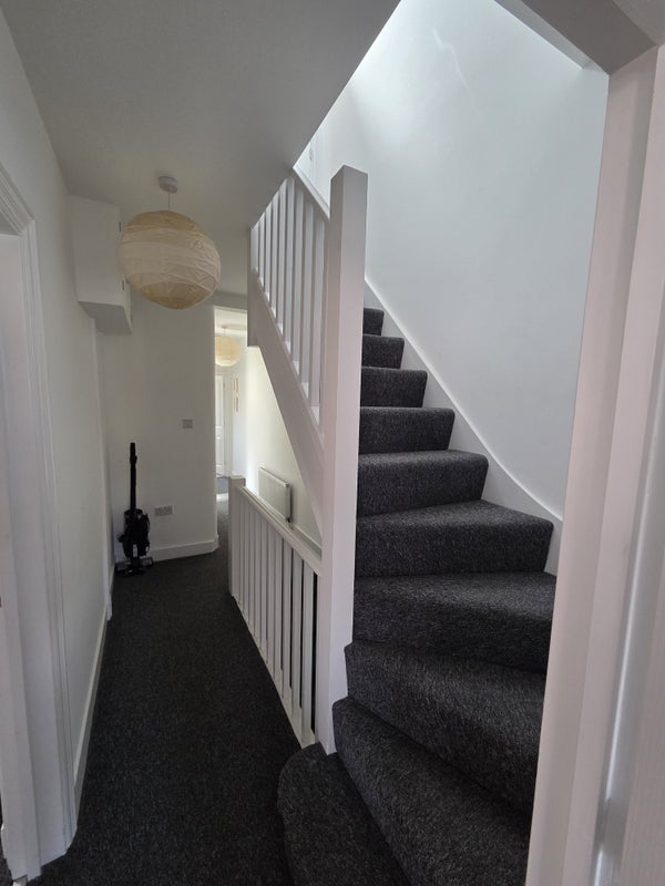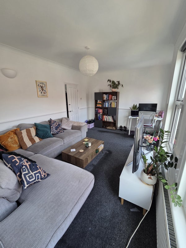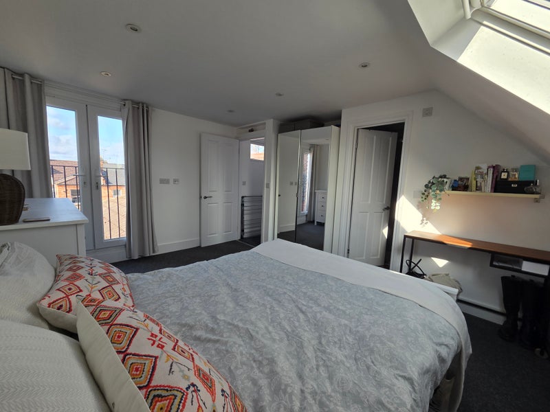 The flat is two floors. The room for rent is on the top floor, with tons of natural light. The furniture pictured may be available for purchase on taking the room, to be discussed. The room has space for a desk and has it's own storage in the eaves.