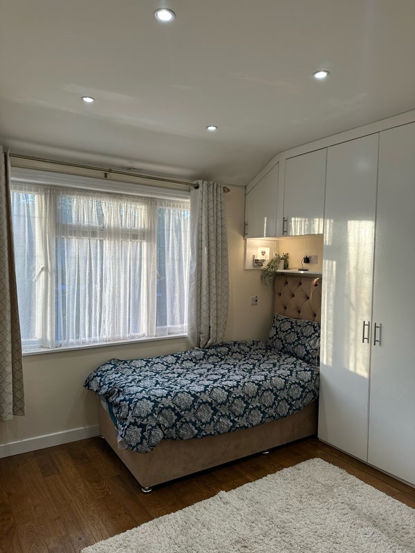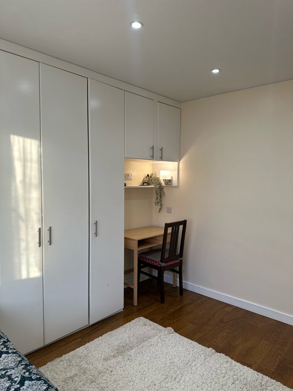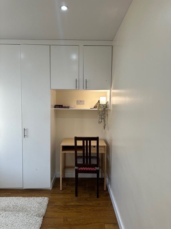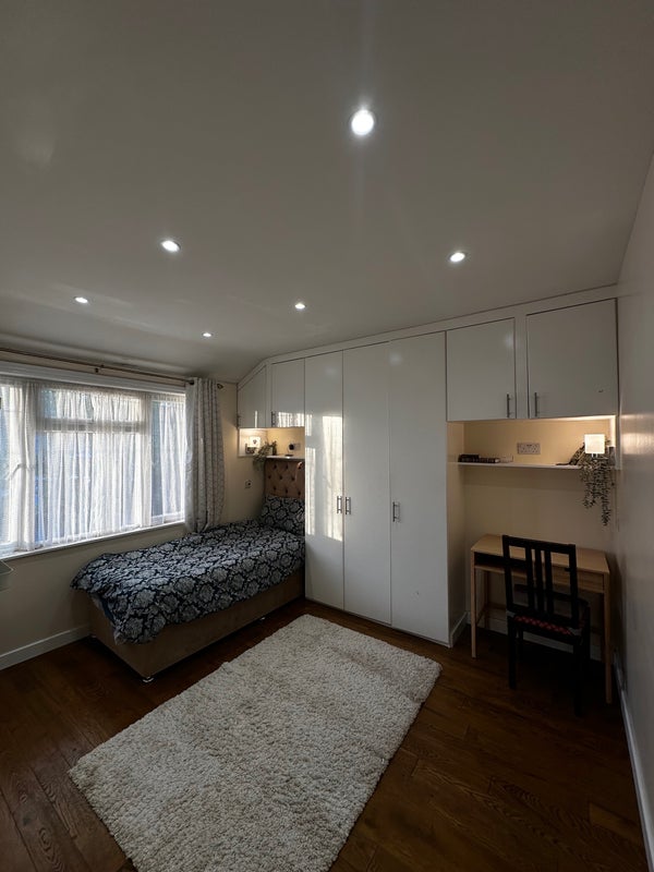 A cozy, fully furnished single room available in a friendly and well-maintained home. The room includes a comfortable single bed, study table, chair, and a spacious cupboard for storage—perfect for a student or working professional.
