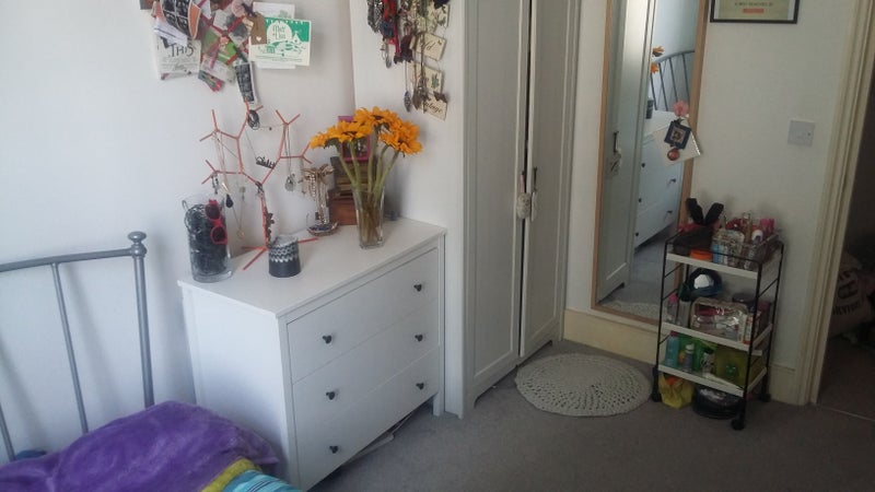 The double room comes with a double bed, chest of drawers, wardrobe and lamp. There is space for storage under the bed and on top of the wardrobe. The carpets and double glazing have been replaced less than two years.