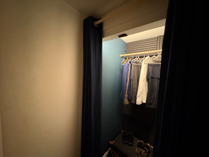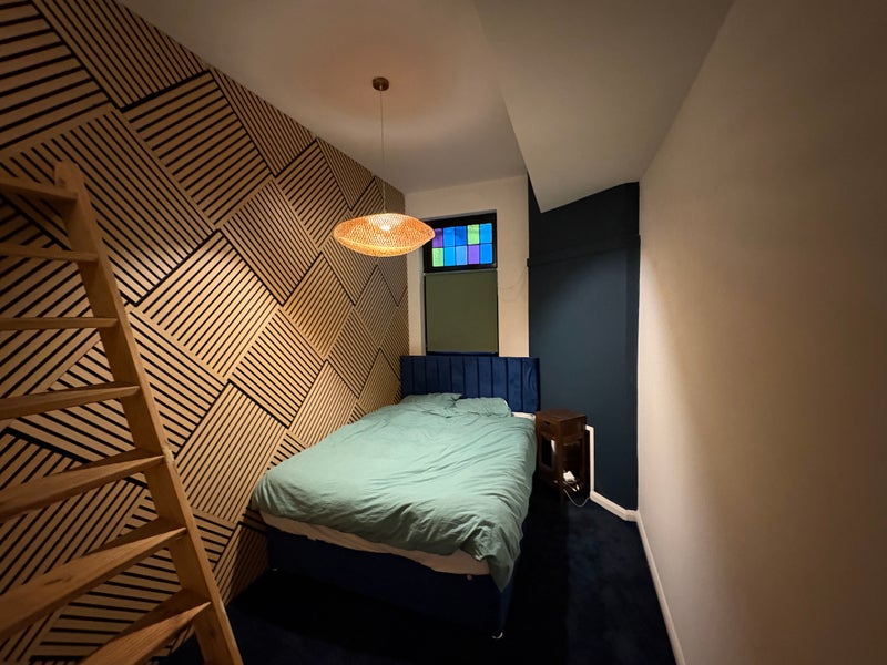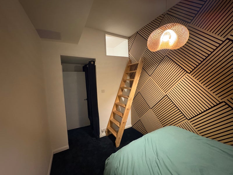 Private bedroom with King sized bed. Recently re-decorated with new carpet. Under bed storage, additional storage space (accessed via ladder- see photos) and separate area for clothes/ hanging area.