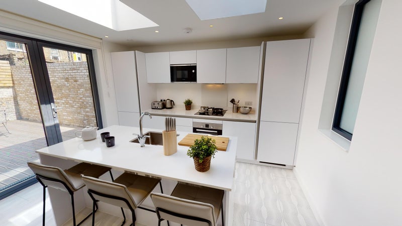 The kitchen and dining room bring in a whole room full of sunshine and light in the summer days with enough toom to allowing for socialising around the table, prepping group meals or sitting down for a glass of wine or water while admiring the outdoor views.