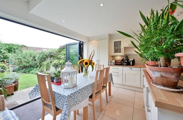 Beautiful large kitchen with table and chairs eating area with a stunning garden view.