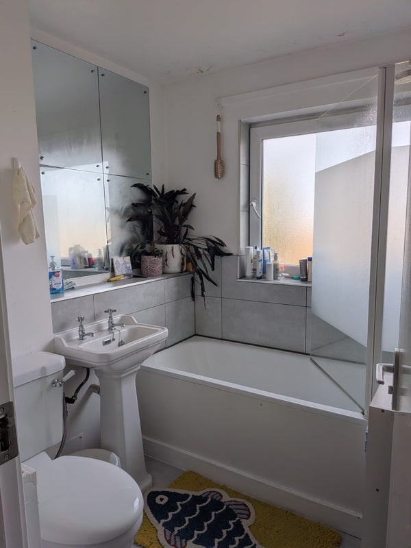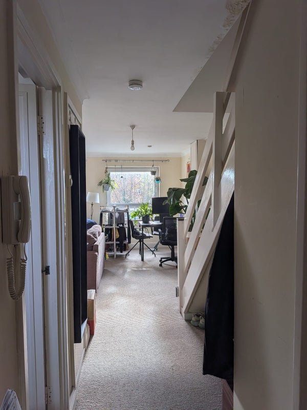 Our house is a 3-bedroom flat with a large shared living space and large kitchen, a shared bathroom and a downstairs toilet, and the three bedrooms upstairs.