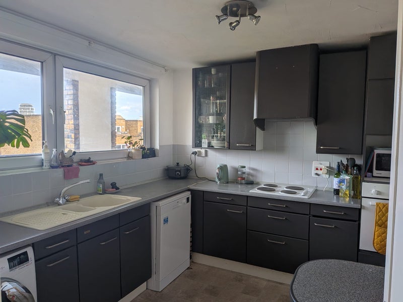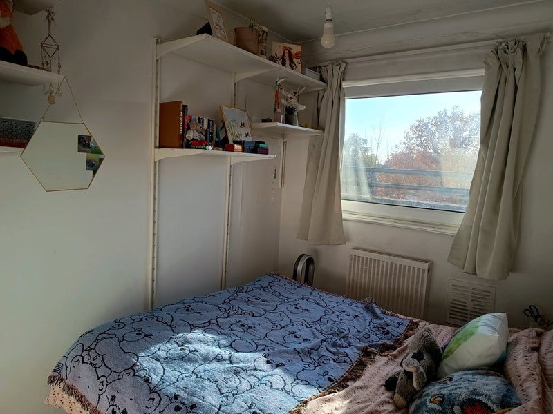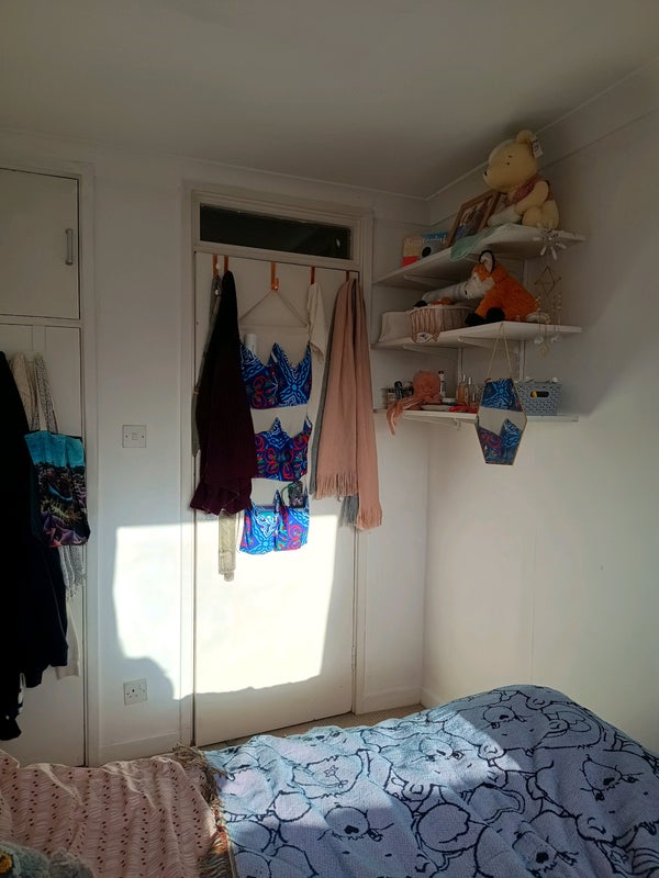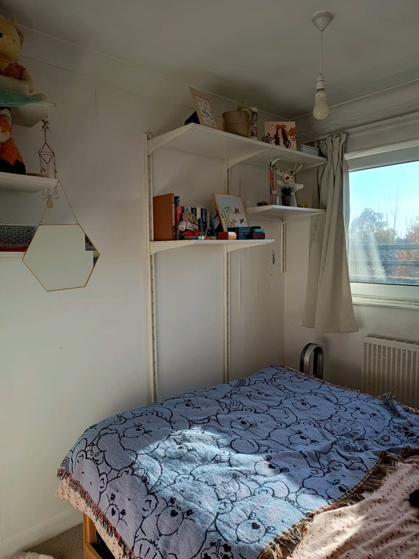 The room is a lovely small double at £710 per month. It is small but has lots of shelves and a big built in cupboard that can store so much! Working from home space is available in the living room.