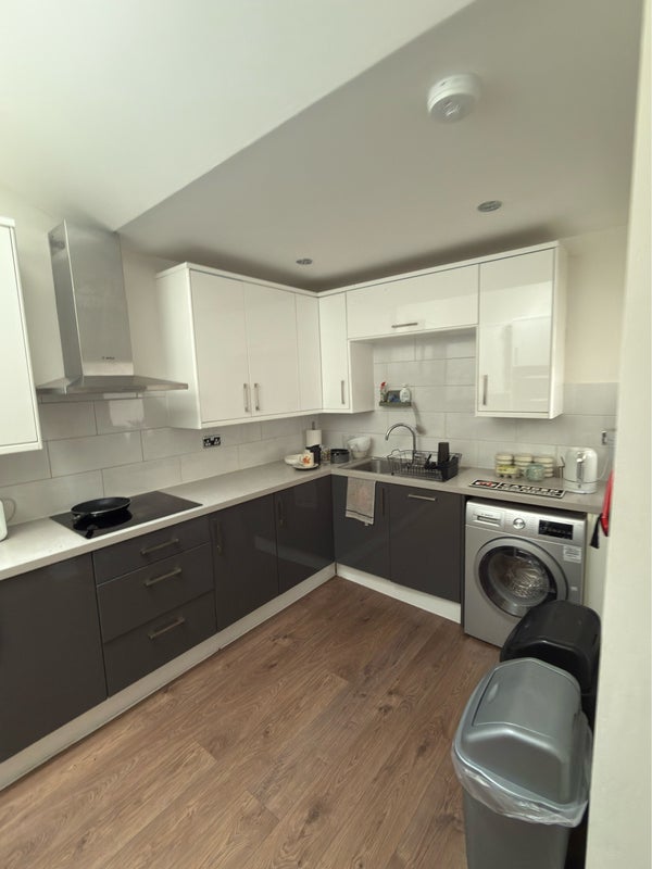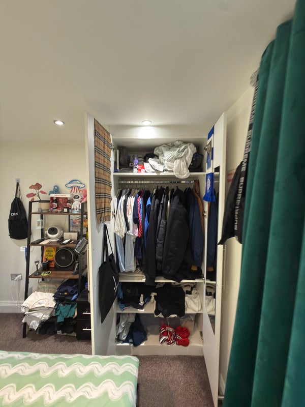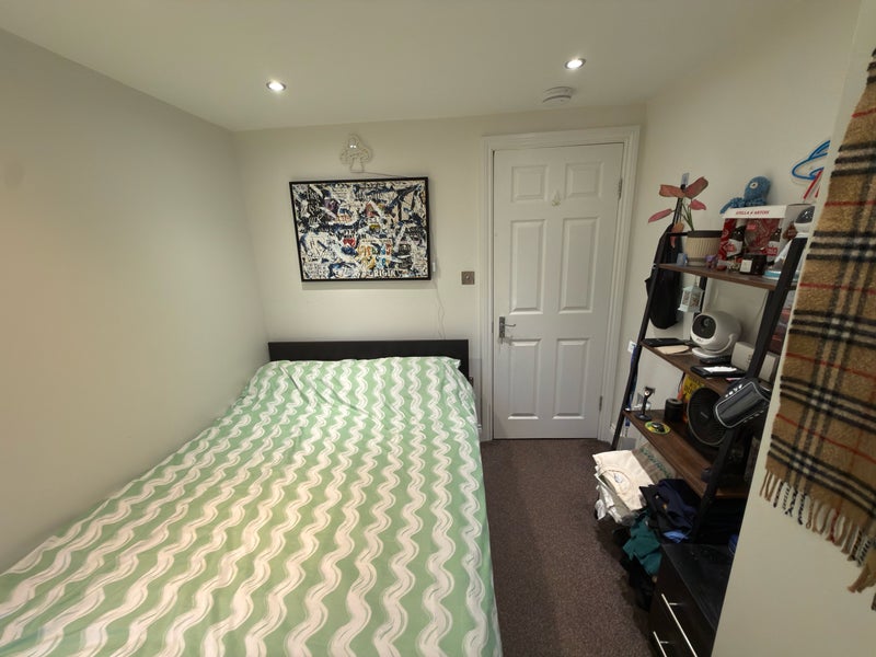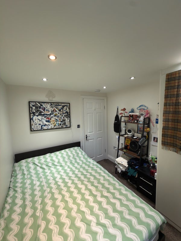 The room is a furnished double, with a bed, bedside cabinet and built‑in wardrobe. The house itself is modern throughout, with new appliances and a contemporary bathroom. There’s a comfortable shared living area and a well equipped