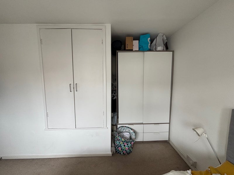 The smaller bedroom is upstairs, cosy & easily fits a double bed, desk and has a built in wardrobe. It gets plenty of natural daylight too (° The room is unfurnished. There is also shelves and a set of drawers outside which you can use for additional storage.