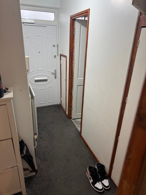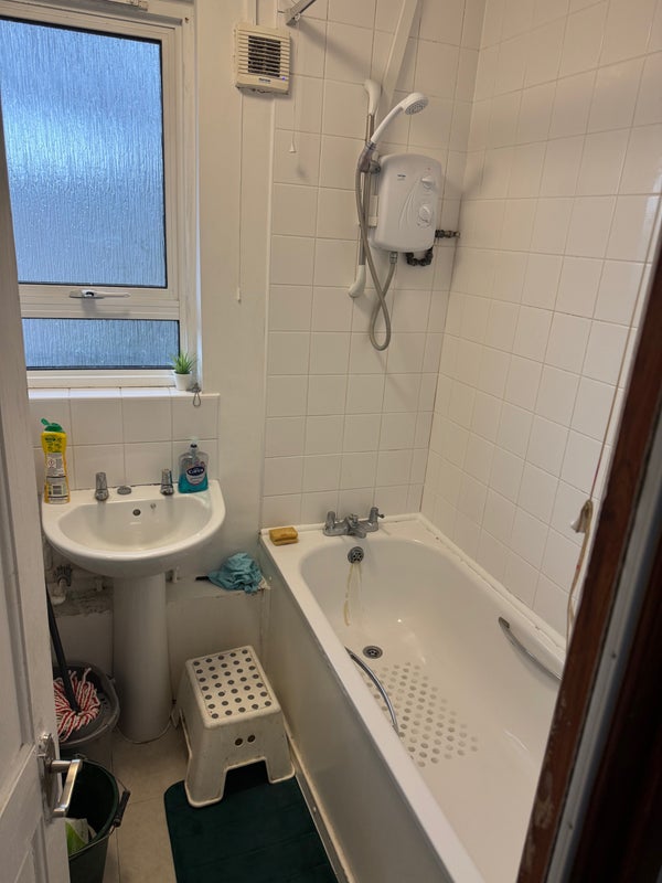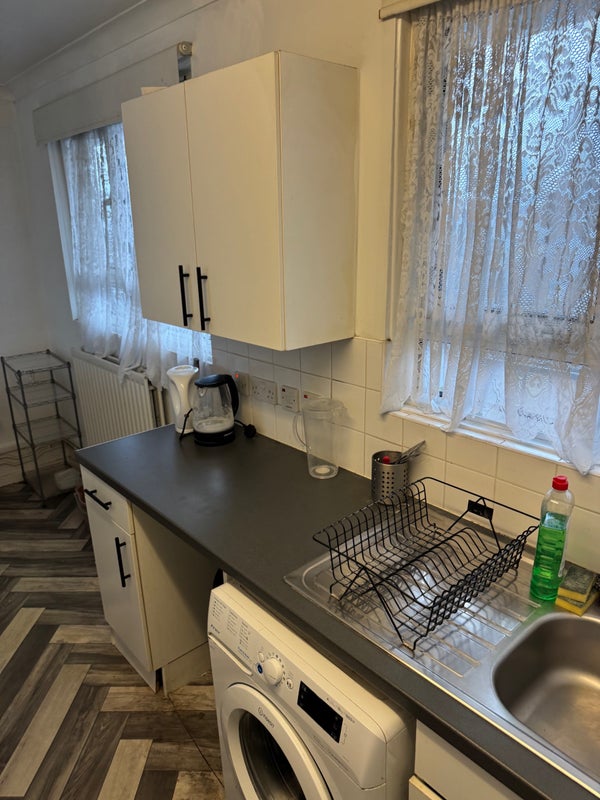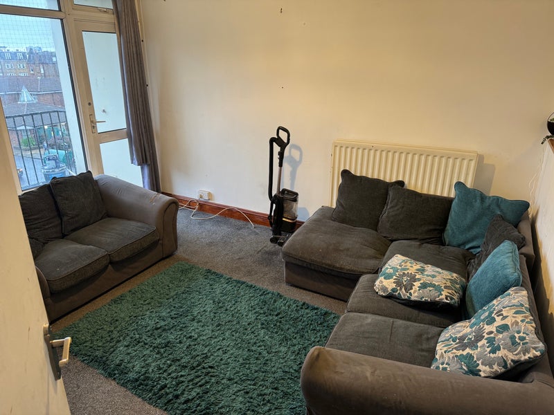 The flat benefits from a private balcony, perfect for unwinding or enjoying fresh air, along with a well-kept kitchen and shared living area.