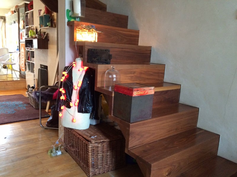 The Mezzanine Double Bedroom has a beautiful unique birch wood and ply staircase with an unusual balustrade that is also a light box with either glorious deep red lighting that can flood the spaces, or a soft white lighting for living and working; the double bed has a very good quality sprung mattress that’s super comfy. There are two/four huge storage drawers under the bed.