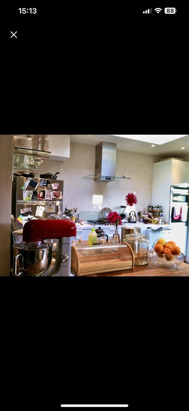 Includes slate floors, a walnut wood island with square sink/storage/ a large flat rooflight, Fisher & Paykel Fridge-Freezer, 5-ring neff gas hob, glass extraction hood, neff double electric fan ovens, nespresso coffee machine, K-Mix+various gadgets, dishwasher, microwave and washing machine.