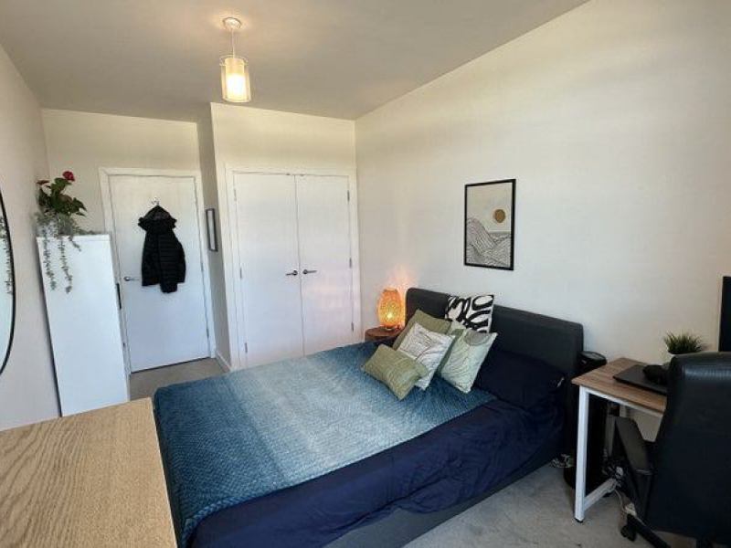 - Queen size bed and mattress, with big built in wardrobe/storage, drawers and shelving unit, bedside tables, desk, chair