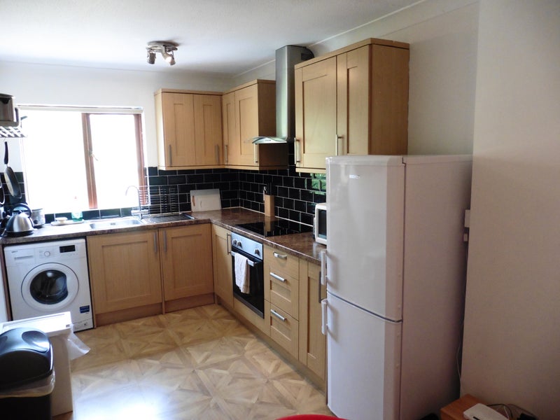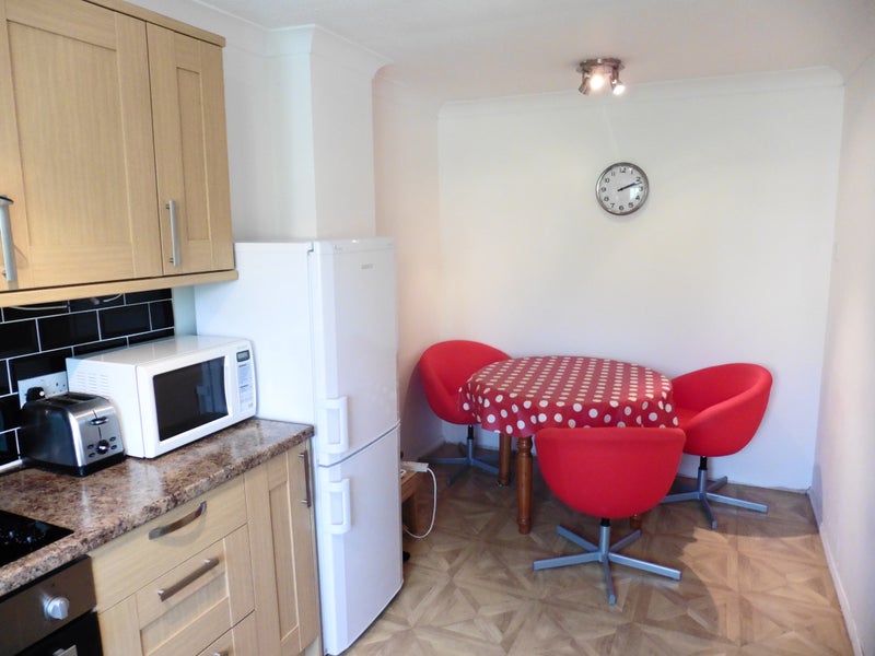 Kitchen is fully equipped with table and three chairs, Electric cooker, Fridge Freezer, Microwave, kettle, pots & pans, dishes, washing machine.