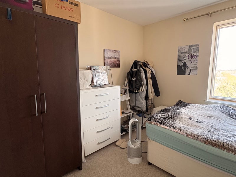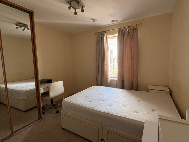 One spacious double room for rent in a 2 Bed 2 Bathroom flat, furnished with a sofa, tables, a chest of drawers and a double bed.