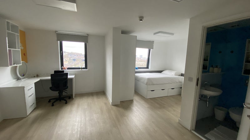 Welcome to a wonderful and unique room of 25 sqm in IQ Haywood House Student accommodation! The property has an ensuite bathroom, a queen size bed and is one of the largest that you can find there, having two windows, a large study corner and 25 sqm of surface. Double the surface than all other rooms in IQ at the same price! The golden suite is located inside a shared flat with five other students that share a kitchen and a living room area. Haywood House offers a large courtyard, a common gym and some common leisure areas.