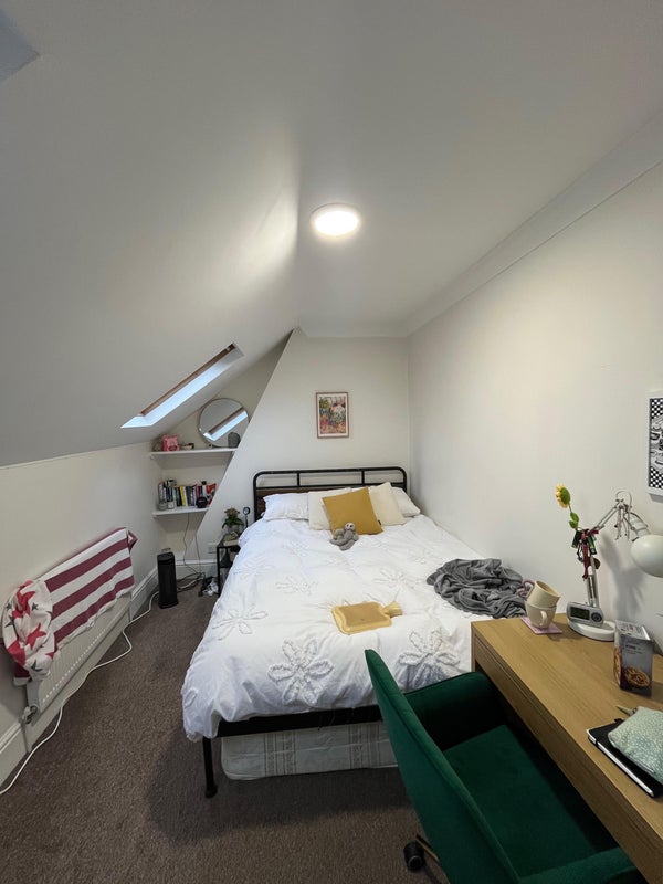 - The bedroom (pictured) comes with a bed, a desk & a small private bathroom on the same floor