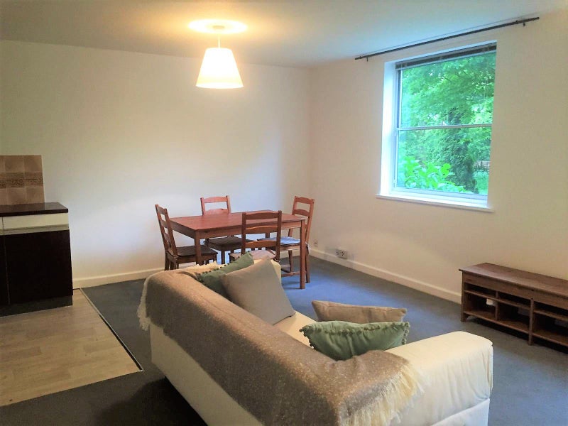 The property features a large and bright living room with ample built in storage, semi open plan kitchen and a full bathroom.