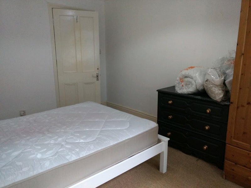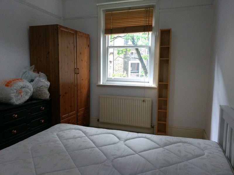Furnished double room of decent size in a mansion block. There is a double bed, wardrobe, chest of drawers, tall shelf, full length mirror and a chair.
