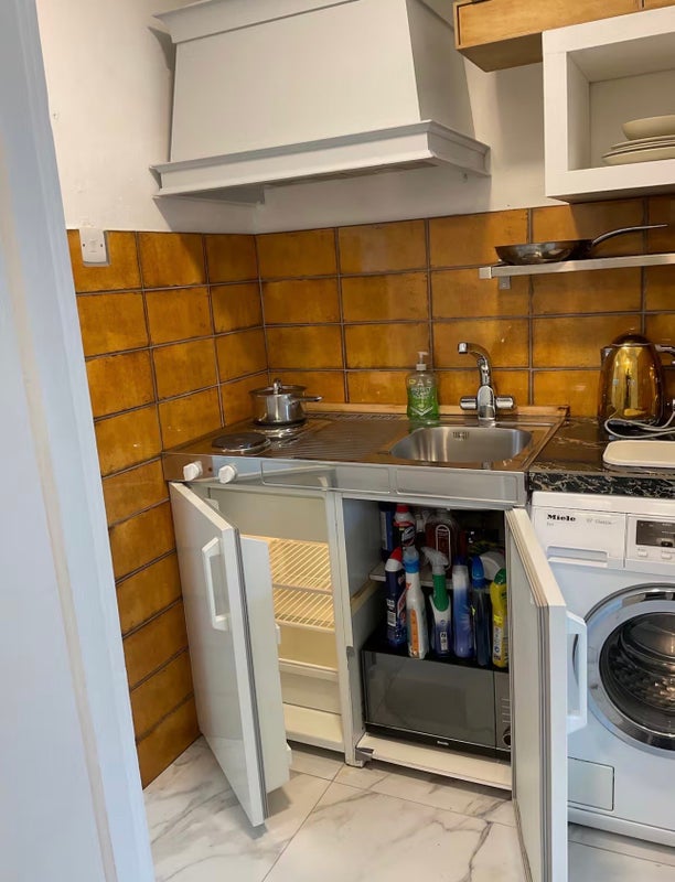 Lovely, bright, and fully furnished modern Studio with own kitchen and bathroom. Central heating and Wifi is available throughout. The studio is located in a great area as it is only a few minutes to high street, markets, restaurants and pubs. 5 minutes walk to West Kensington station, 10 minutes to Baron's Court station and 1 minute to 24 hour buses.
