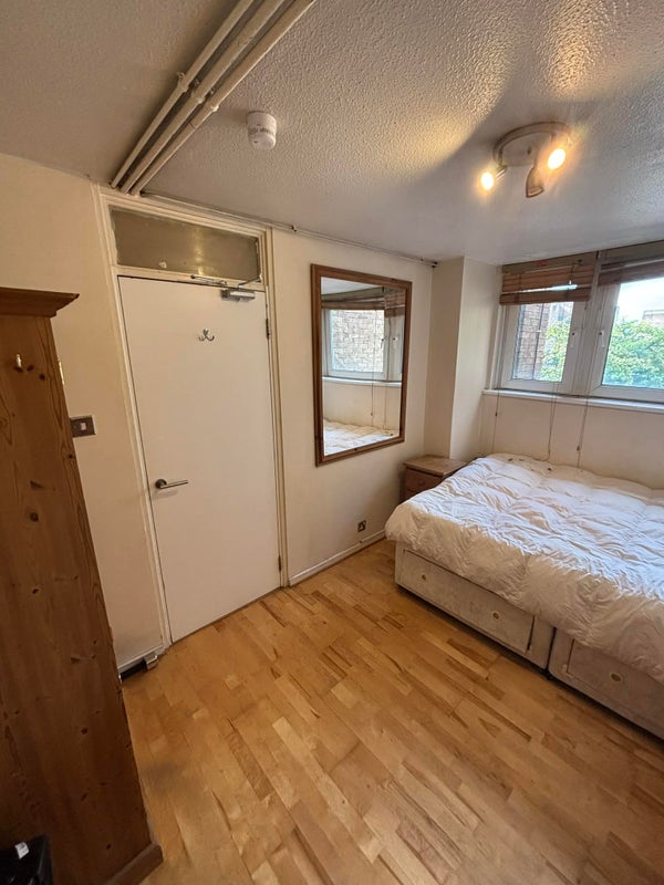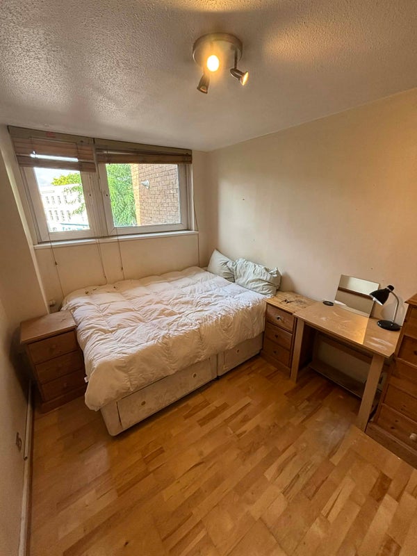 The room comes furnished with a large double bed, a comfortable desk setup ideal for WFH, and plenty of storage. It gets lots of natural light, as does the rest of the flat.