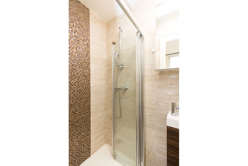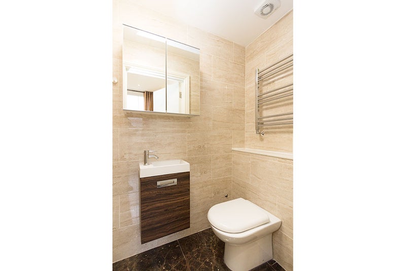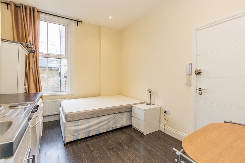 Self-contained studio flat in North End Rd, W14. It offers open-plan kitchen with washing machine and bathroom with shower.