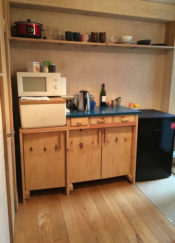 The bedroom is furnished with double bed, table, wardrobe, drawers, sisal flooring and beech wooden floor in the kitchenette/study area.