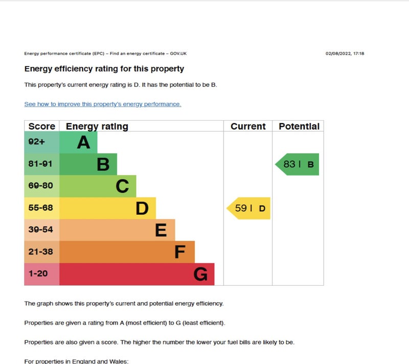 EPC details: Currently D. However, the house has had a new condensing boiler installed and is double glazed.