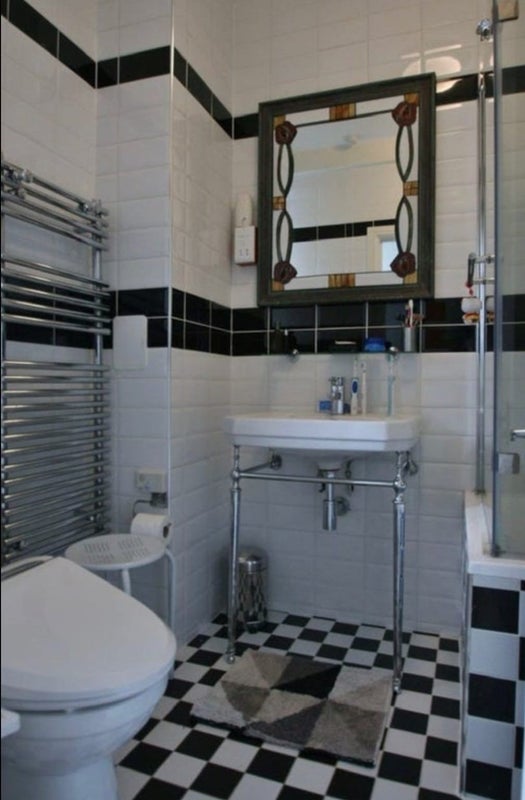 Includes a double bed, an extremely large wardrobe, a bed side table and a mirror, and it has a fireplace. There is one bathroom in the flat fitted with sink, mirror, heated towel rail/ radiator, shower and bath (plus an electric toilet).
