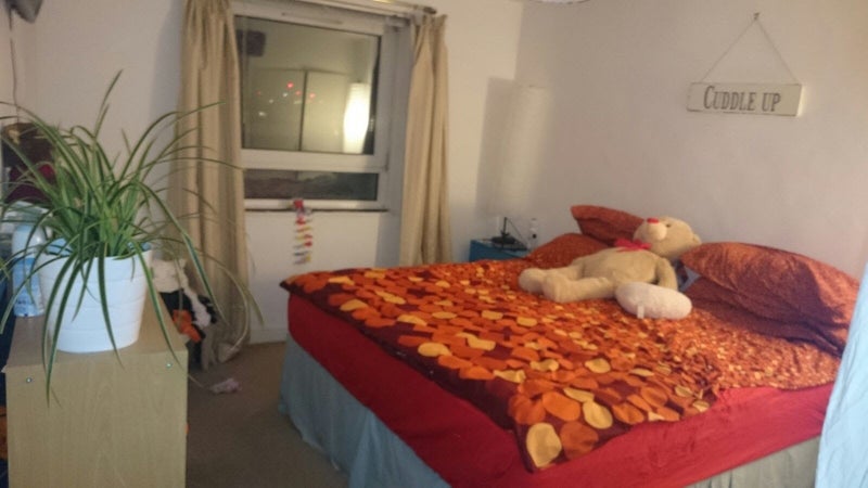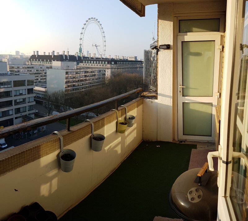Bedroom is a double (but fits a super king) and is currently semi-furnished with a larger built-in closet, with its own balcony door and a view of the London Eye. Room is semi furnished (comfy double bed and 2 side drawers).