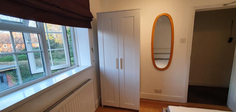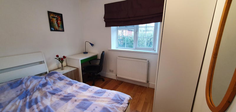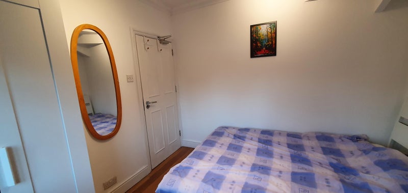Good size double room with solid wood floor, 3 doors wardrobe, double bed, desk, chair, bedside table and table lamp.