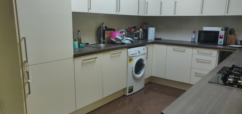 Beautifully extended kitchen provide shared living area with sofa, dining set, 2 fridge/freezers, washing machine, microwave, kettle, toaster, vacuum cleaner, iron, ironing board plus all utensils.