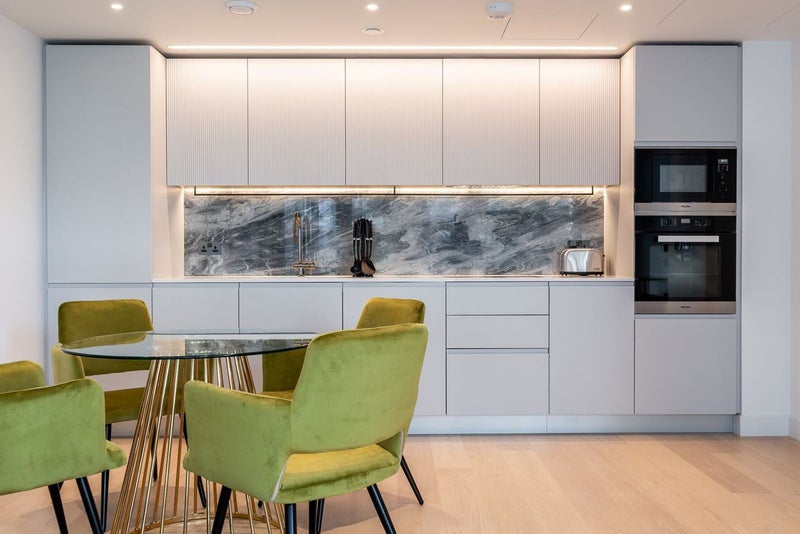This bright and airy apartment has been thoughtfully designed to the finest detail with a luxury furniture pack. The carefully considered specification creates a beautifully crafted home with elegant finishes. Sleek kitchen units and stone worktops come together with the wood flooring to provide a stylish look. The chrome bathroom fittings and contemporary sanitaryware work in perfect harmony with the elegant bathroom tiles.