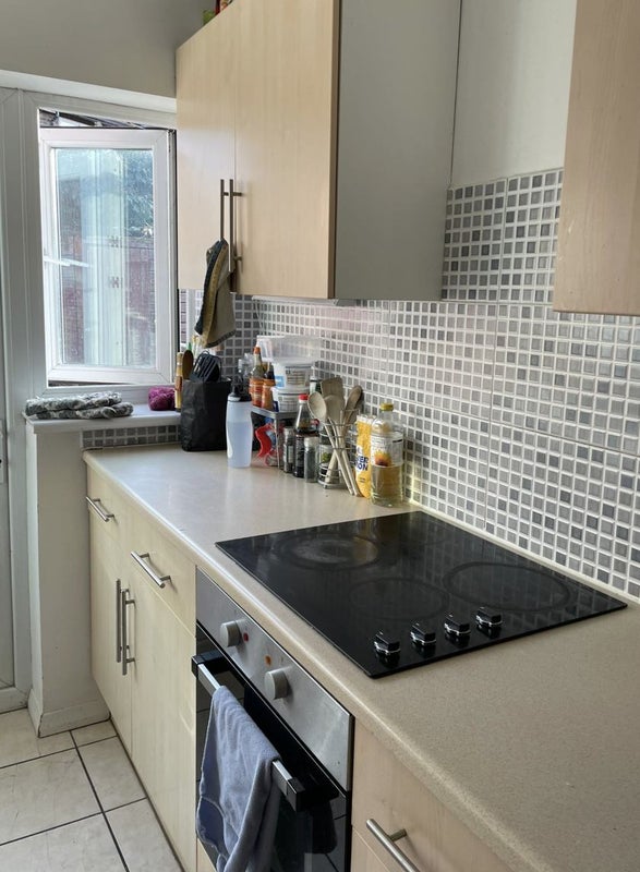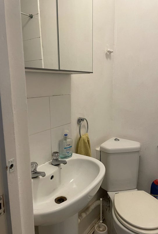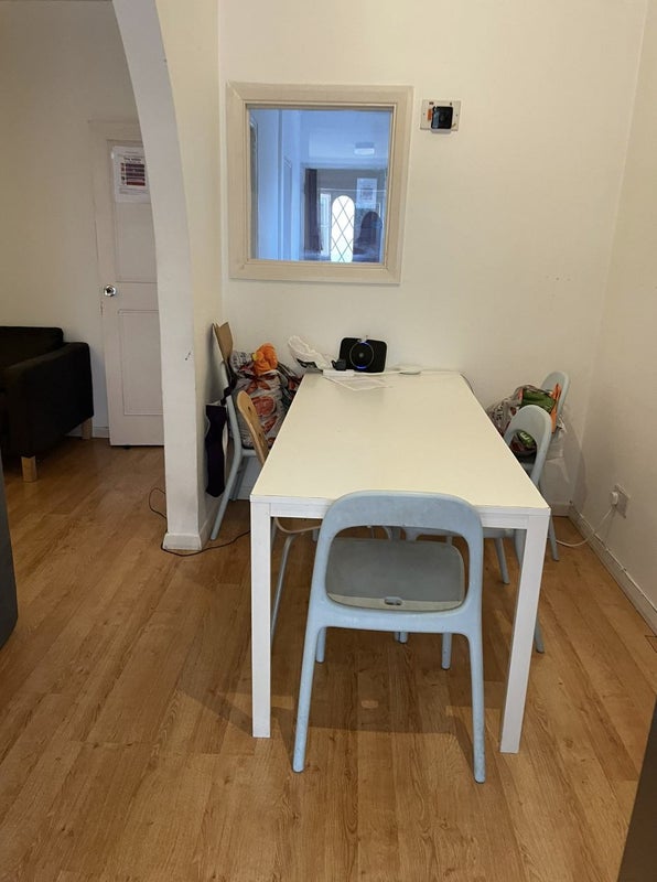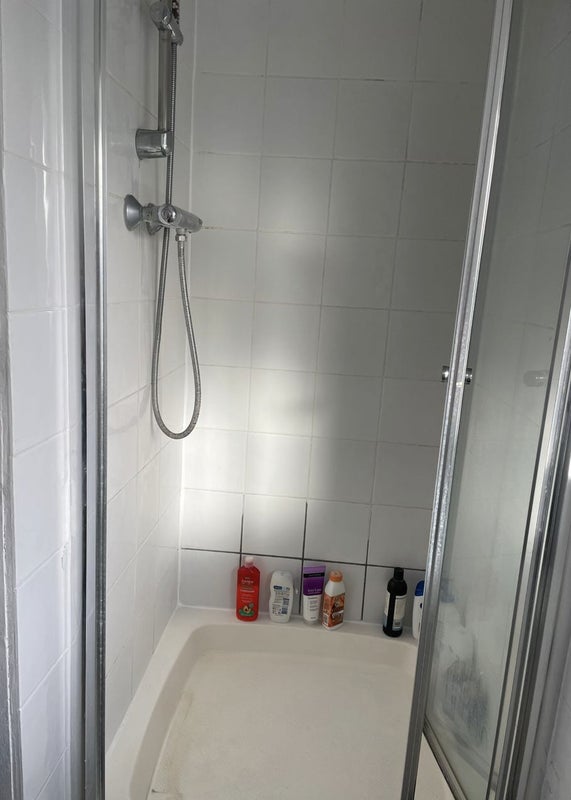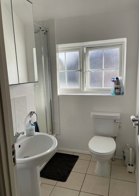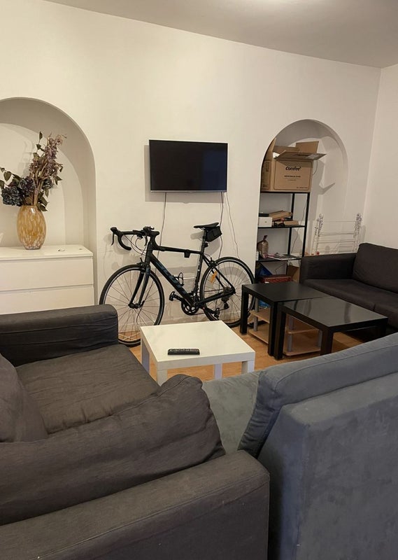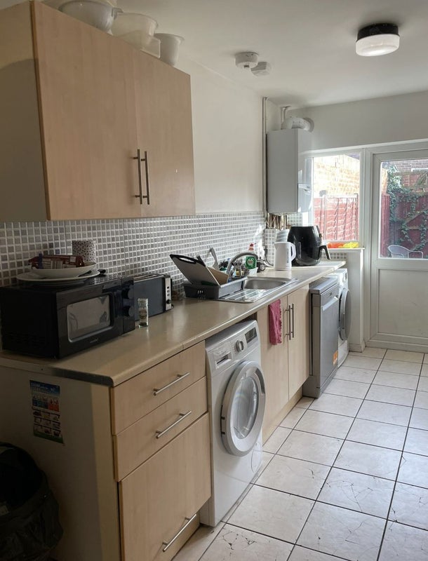 The house is fully furnished and includes a dishwasher, washing machine, dryer, and two shared fridges. There are two bathrooms shared between five people, as well as a shared living room with a TV.