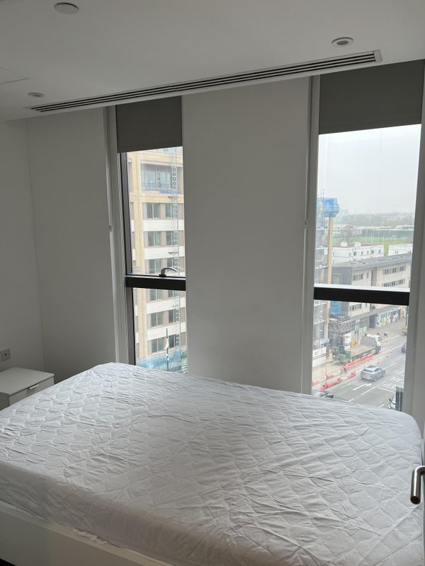 Furnished bedroom available in a large 70 square meter, luminous two-bedroom flat. The room, £1100 pcm, has a bed, a wardrobe, and a bedside table.