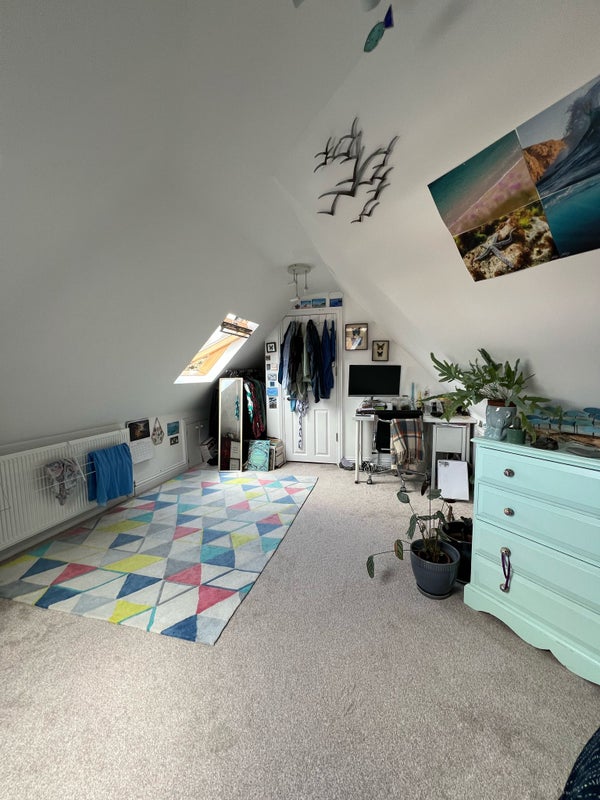 🛏️ The Room: • Really large loft room on the top floor with its own staircase • Quiet • Clean White walls• Eaves storage running along the entire perimeter of the room.
