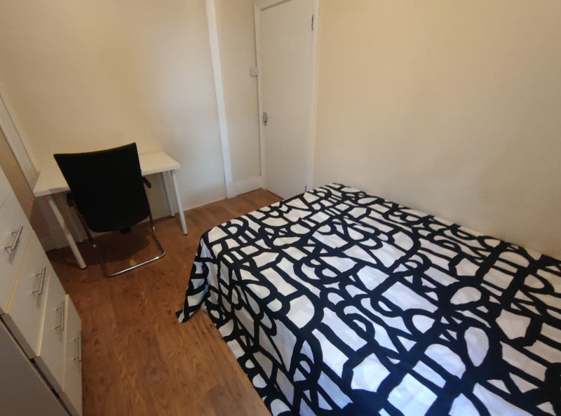 Bright and spacious double room available in a well-maintained house in Tottenham (N17 0ND), ideal for professionals or students. The room comes fully furnished with a double bed, large wardrobe, chest of drawers, and a study desk with chair, offering a comfortable space to relax and work from home.