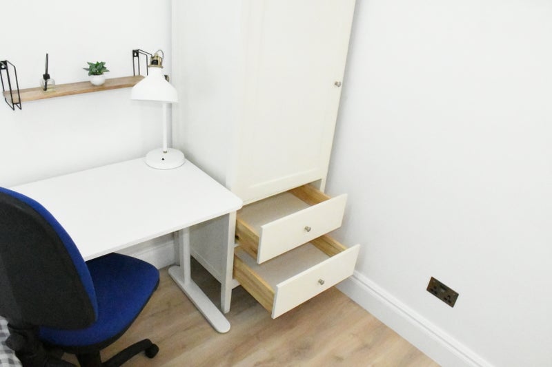 Room comprises a large wardrobe, computer desk, office chair, double bed, chest of drawers, bedside table, Floor lamp etc...