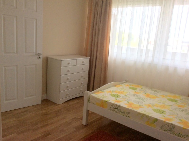 Double bed with memory foam mattress, wardrobe, chest of drawers, bedside cabinet, table and armchair.