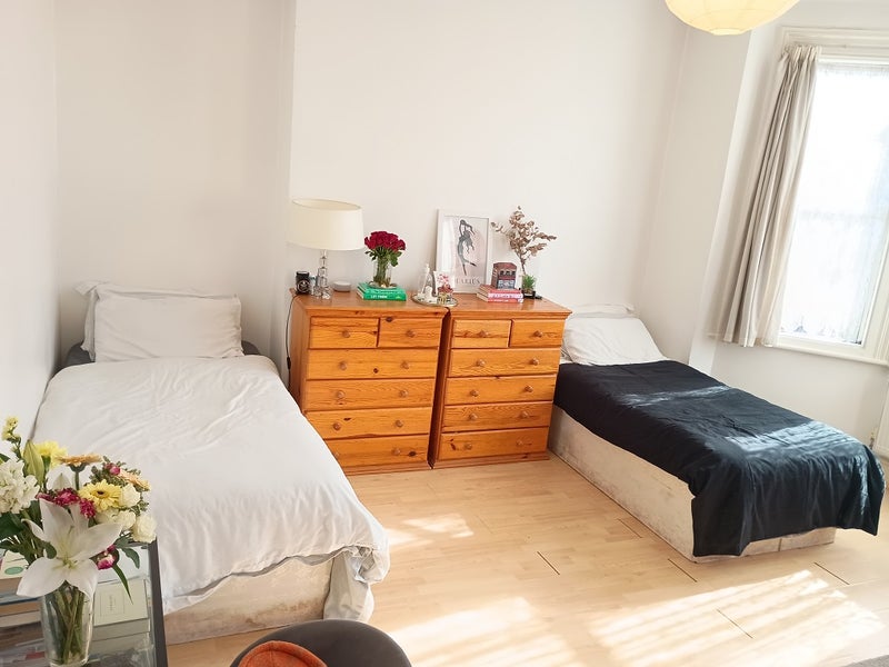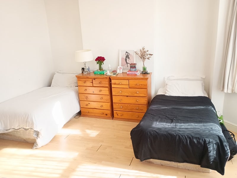 Huge twin bedroom available to rent in a houseshare in Willesden Green (zone 2). The bedroom is fully furnished with 2 separate beds, 3 wardrobes, and 2 chest of drawers.