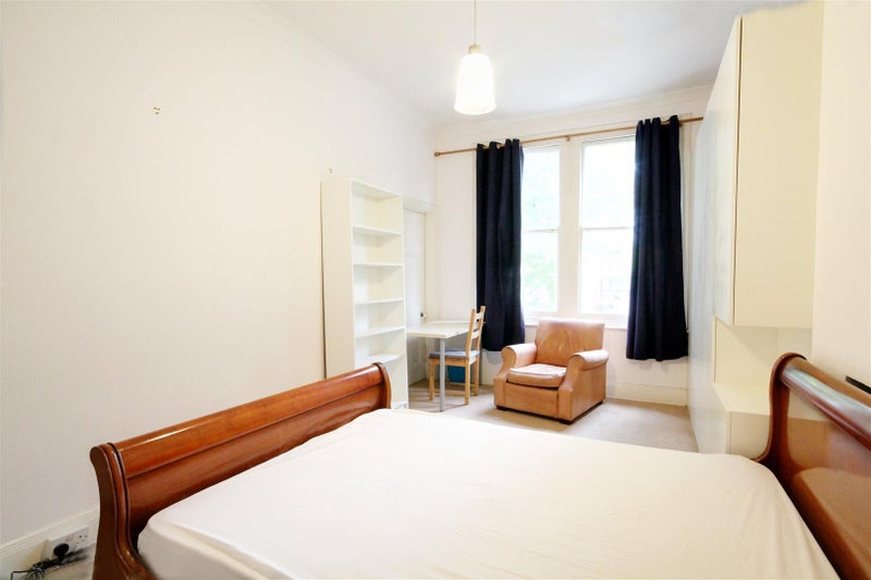 This room comes fully furnished with ample storage, a double bed and mattress, a desk and chair, and shelving. The property’s amenities include a fully equipped kitchen, bathroom, and separate W/C, shared with only three other rooms.