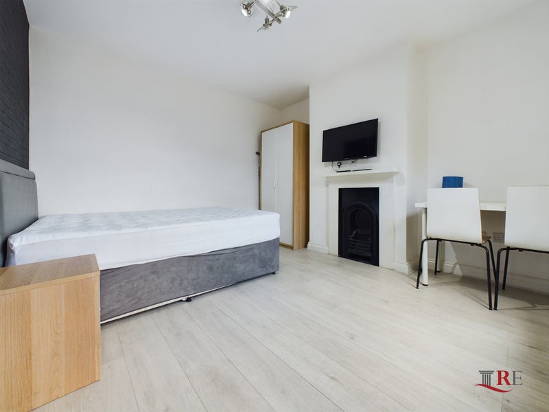 This room comes furnished with a double bed and mattress, desk, chair, wardrobe, bedside table, and TV. Communal areas include a fully fitted kitchen, shared garden, and three full bathrooms shared between five rooms.