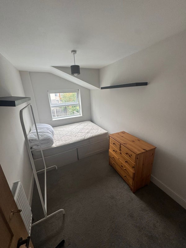 Room is on the smaller side but comfortably fits a double bed, chest of drawers and wardrobe, with space to move around. A desk would be a squeeze, but there is a desk available in the living room for working from home which none of the other flatmates use.