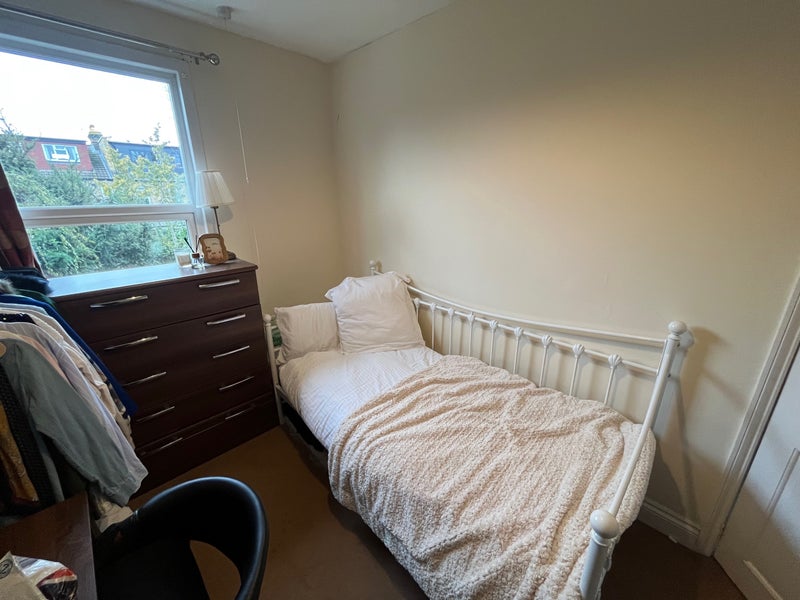 We have a full sized third bedroom that we share for guests to stay, clothes storage and a desk. The room is technically unfurnished but I would be happy to sell bits if needed (bed and mattress are 1 year old and rarely used as I travel a lot for work). I’ve popped my flatmates original ad below.