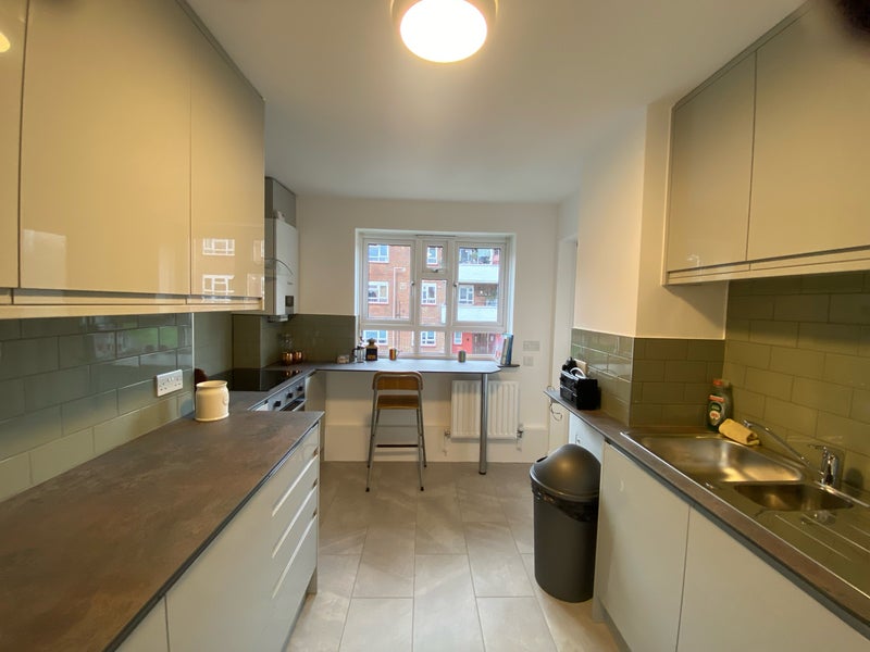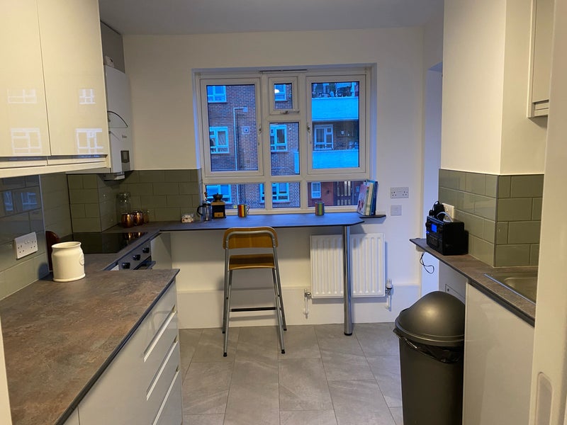 Brand new stylish kitchen with plenty cupboard space with breakfast bar for dining & access to balcony. Brand new appliances, including top of range boiler, large fridge freezer, washing machine and drier.