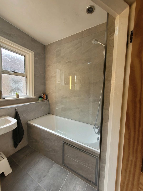 Bathroom: Recently updated bathroom with floor-to-ceiling tiles and a powerful shower.