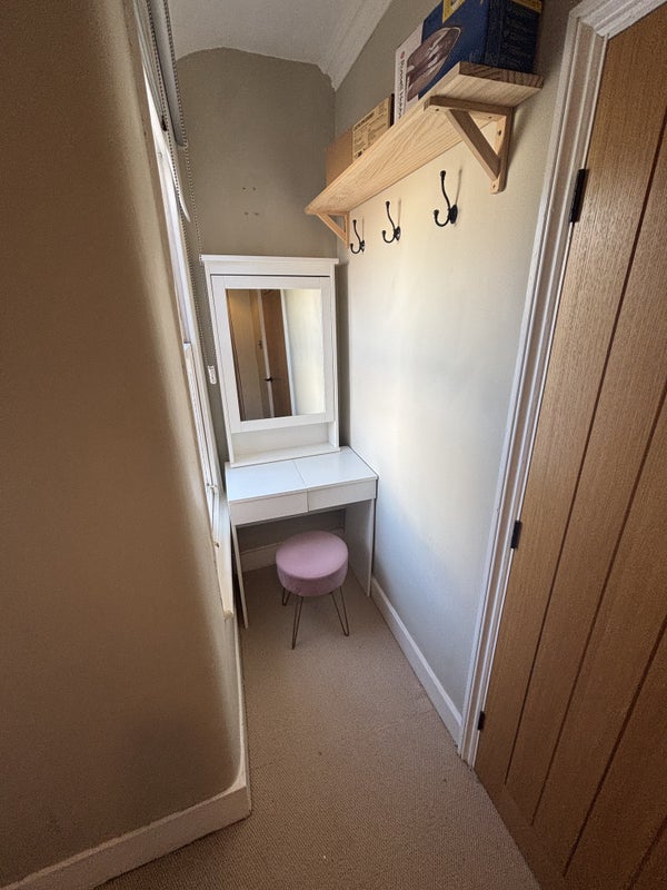 The room is a good-sized double with a double bed, large built-in wardrobe and a table/desk (the table can be removed if you prefer more space). The flat is fully furnished, so you won’t need to bring any kitchen appliances or furniture. The kitchen is well equipped with things like a Nespresso machine, microwave and air fryer. Bills are not included and will be shared equally (est £200)