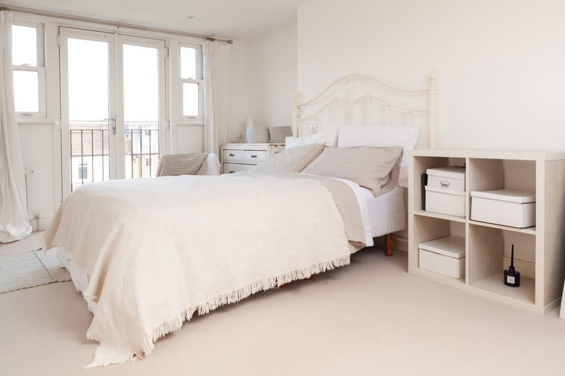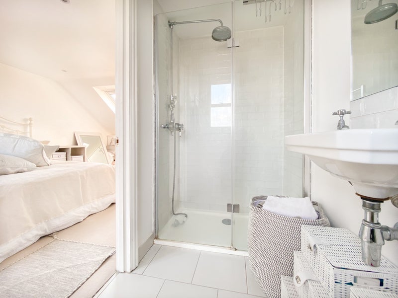 This stunning large loft bedroom with ensuite shower room has plenty of storage. There are french windows overlooking the garden and also a skylight making the room bright and airy. It's just like having your own apartment!