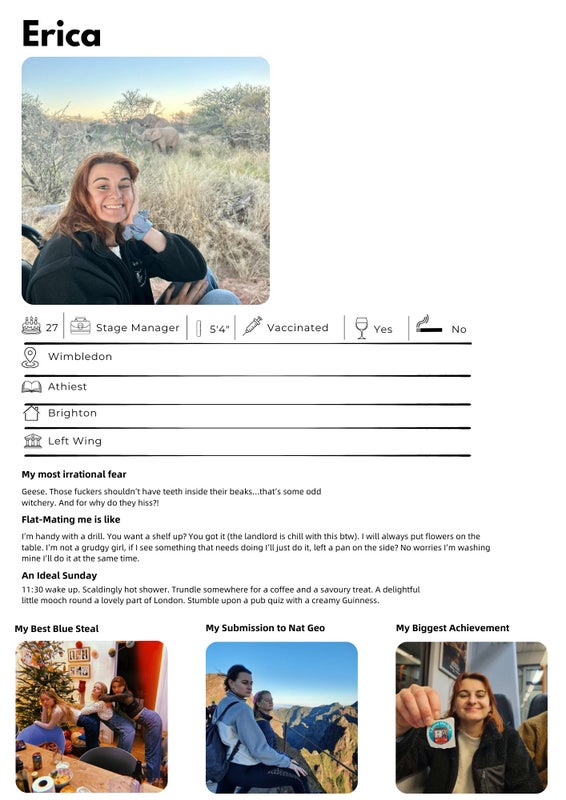 We are Amber and Erica and we have lived in our abode (which we consider to be a palace 😂) in Wimbledon for the past four years. Our flatmate is moving in with her boyfriend and we are looking to fill her room from April. All information about us is included in our mock-up Hinge profiles below to give you a flavour of us 😂 (thought this would be a hilarious joke, but the hours spent on Canva making them probably took some of the humour of out it🤦♀️😂)