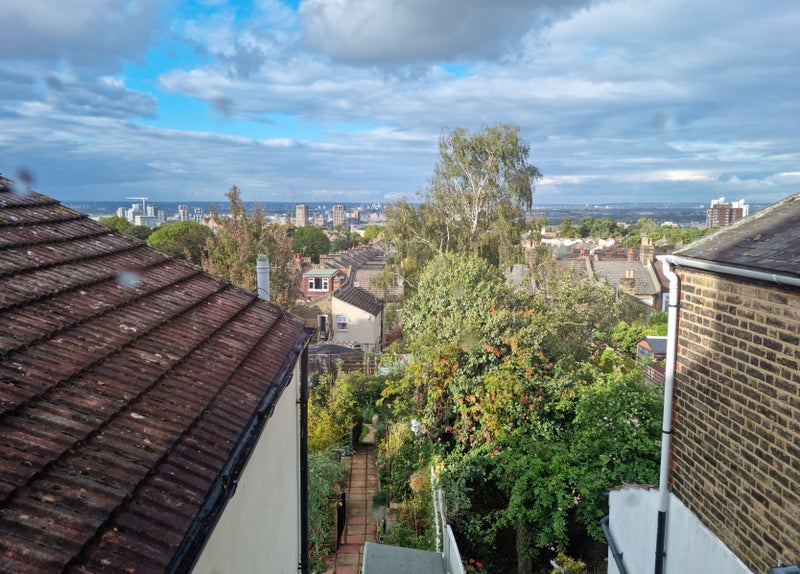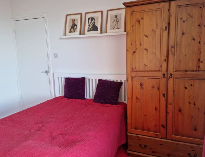 The room is on the 2nd floor of the Victorian house facing garden with river views in distance. The double bed has orthopaedic matrass. There is double wardrobe, chest of drawers, under bed storage, desk, chair,2 x lamps, shelves.