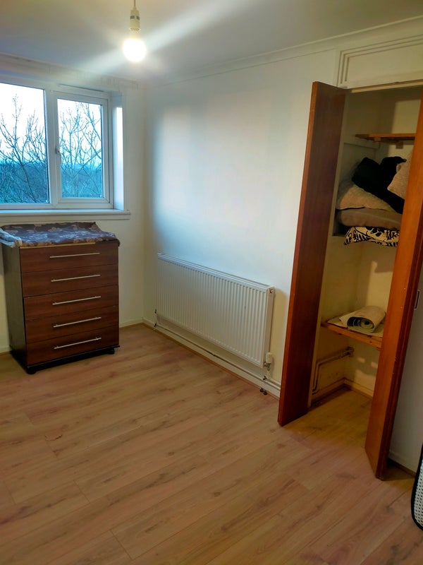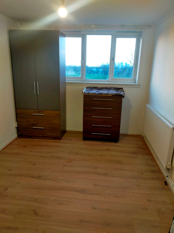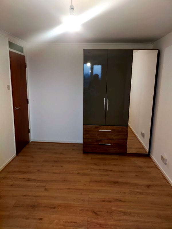 laminate wood flooring, radiator panel to side, double glazed window overlooking Woolwich Common road. 1 x double wooden wardrobe and an extra single wardrobe, x 1 chest of drawers, built-in storage cupboard, electrical power connection points.