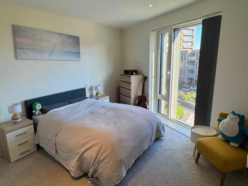 The apartment features a bright open-plan living and dining area with large windows that allow plenty of natural light to fill the space. The contemporary fitted kitchen comes complete with integrated appliances, sleek cabinetry, and ample worktop space, making it ideal for both everyday living and entertaining. The living area also provides access to a private balcony, perfect for relaxing or enjoying views of the surrounding development.